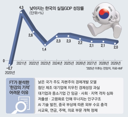 22일 파이낸셜타임즈(FT)는 아시아판에 ‘한국의 경제기적은 끝났는가’라는 제목의 기획 기사를 게재했다. FT는 국가 주도 자본주의로 삼성전자나 SK하이닉스 같은 첨단 제조 대기업을 육성한 한강의 기적이 이제는 낡은 모델이 됐고 수명을 다하고 있다고 지적했다.