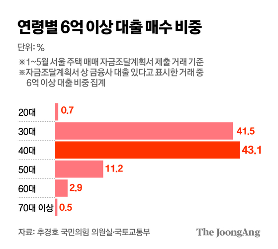 고액 대출 주택 매수를 연령대별로 분석한 결과, 30대와 40대가 전체의 84.6%로 압도적 비중을 차지했습니다. 이 중에서도 30대가 41.5%, 40대가 43.1%로 나타나, 자산 축적 기회가 상대적으로 부족한 젊은 세대가 주택 매수 시 금융권 대출을 크게 활용하고 있음을 알 수 있습니다. 반면 자산이 어느 정도 축적된 것으로 추정되는 50대는 11.2%, 60대 이상은 2.9%에 불과했습니다. 이는 젊은 세대의 부동산 시장 진입이 금융권 대출 의존도가 높아질 수밖에 없는 현실을 반영하는 것입니다.