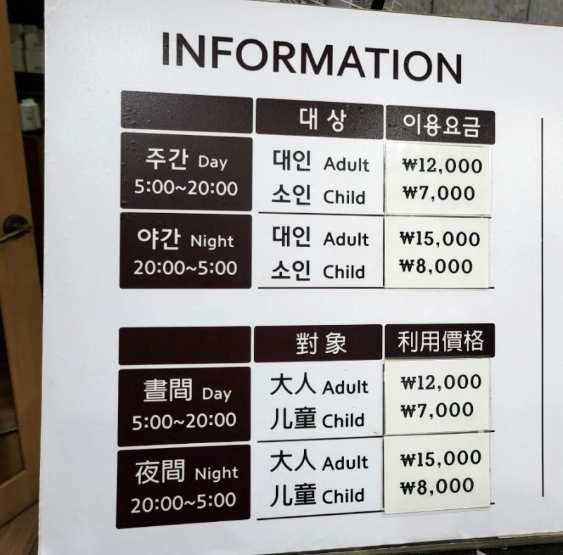 • 日中料金 (08:00~20:00): 大人12,000ウォン / 子供7,000ウォン