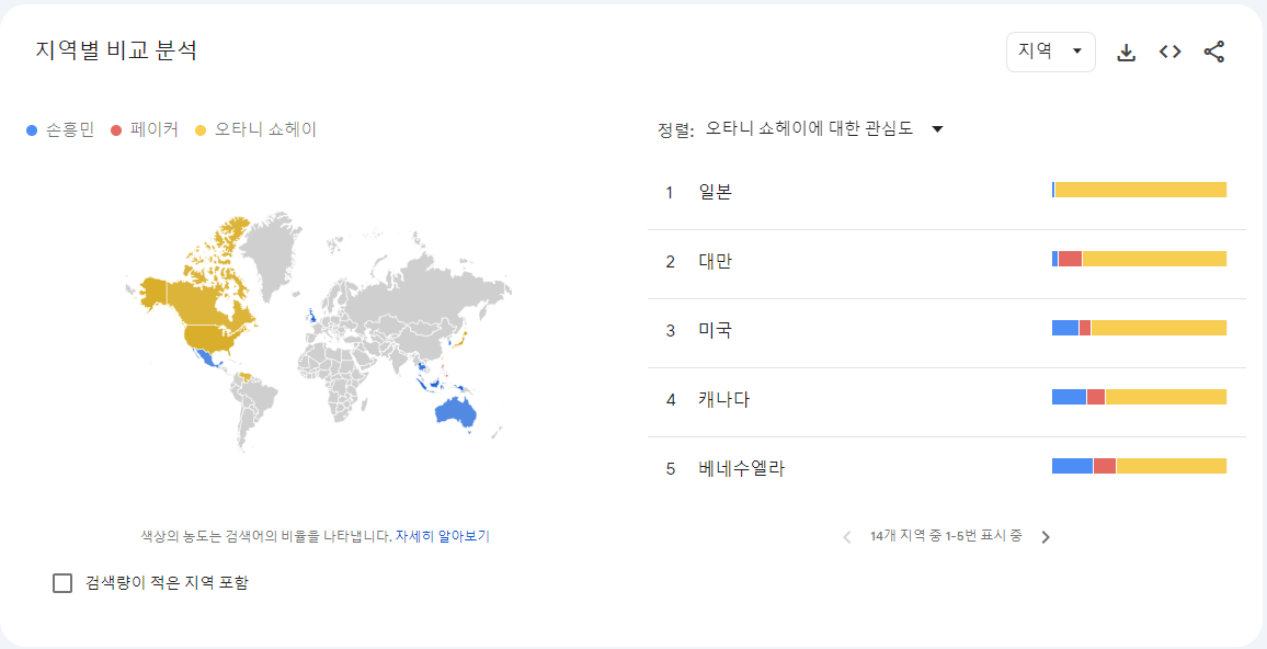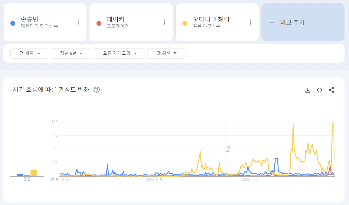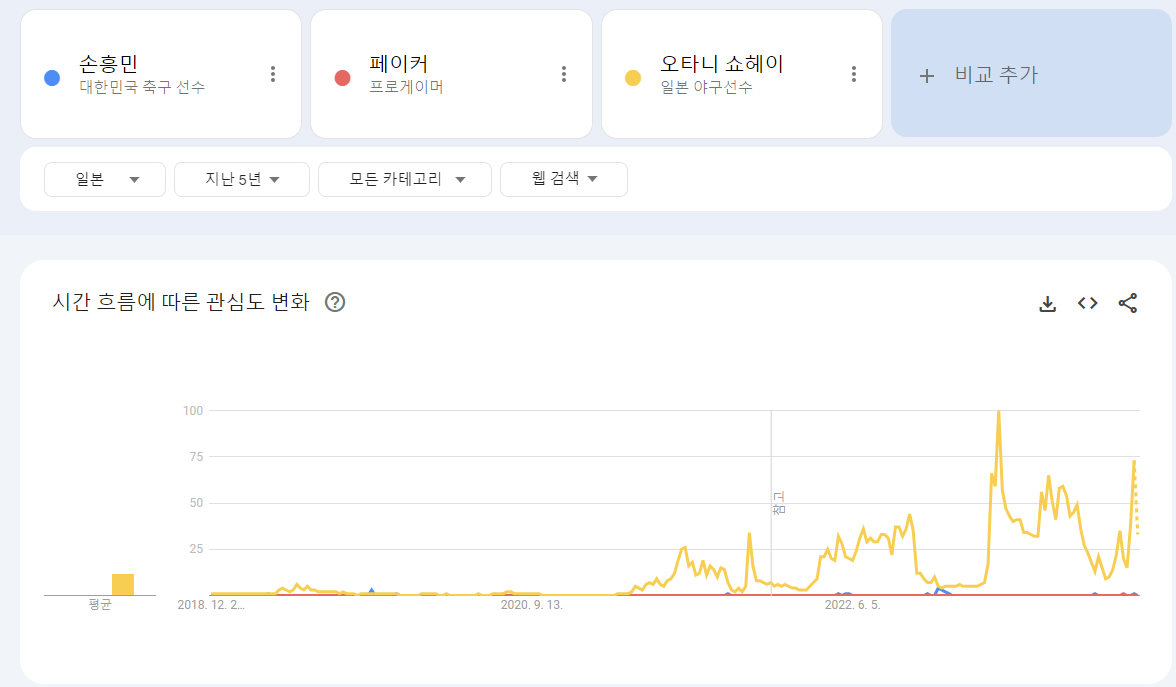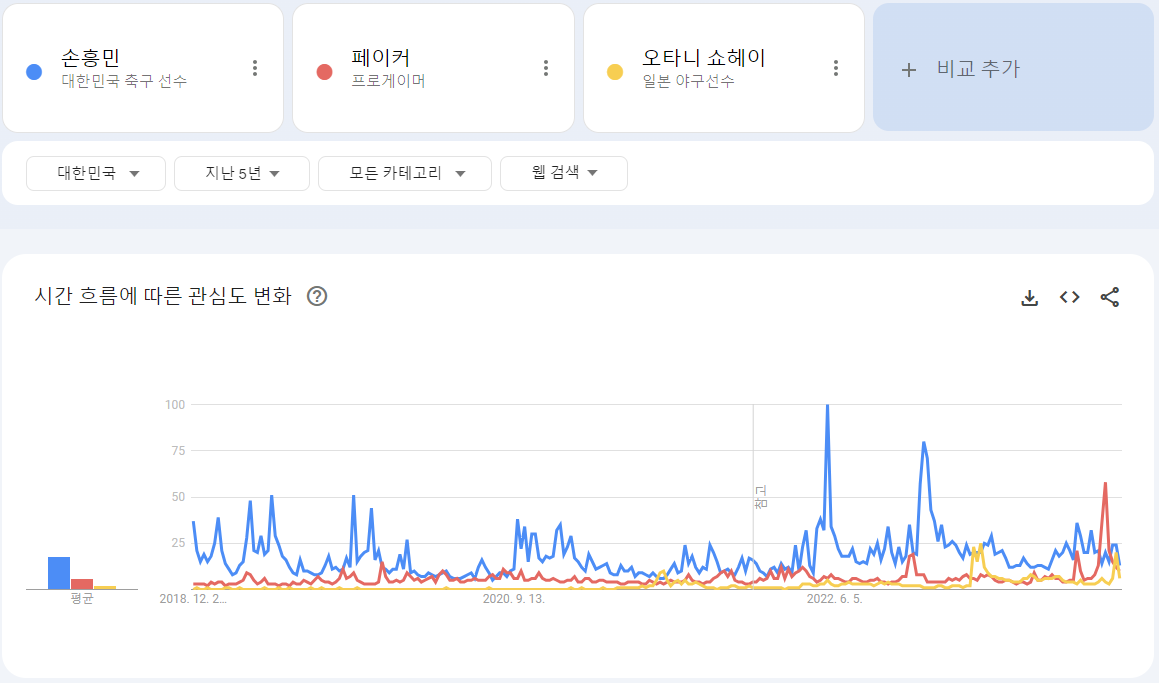 ほとんどの期間、特にワールドカップやアジアカップ、国際Aマッチとプレミアリーグのトッテナムの試合がある時期にソン・フンミンが主要な関心事であり、大谷翔平は昨年末のLAドジャースとの大型契約時に検索が急増しました。