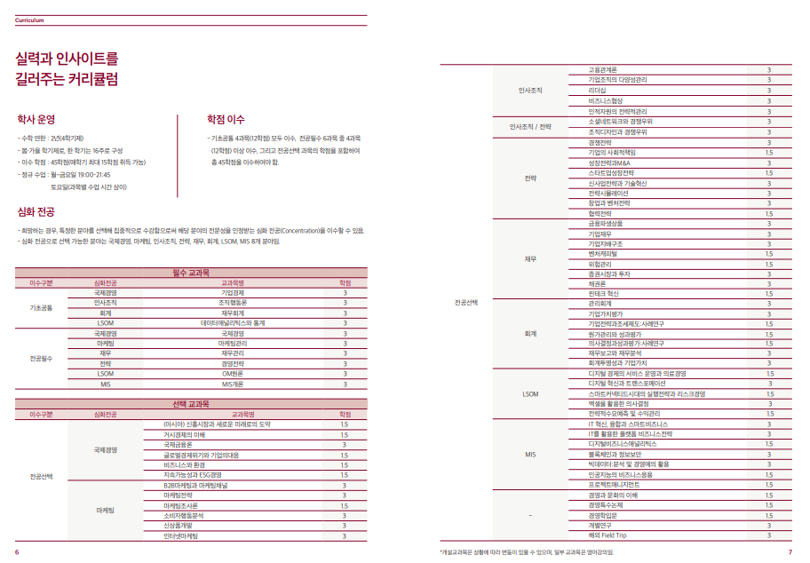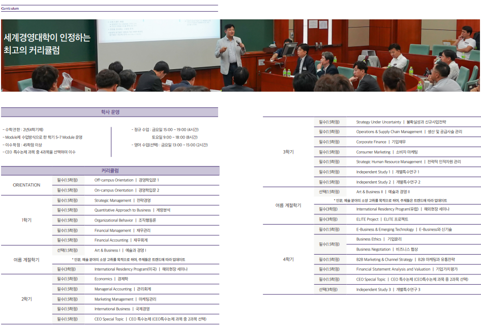 - 국내 경영 환경 맞춤 교육: 한국의 경영 환경에 특화된 커리큘럼을 통해 국내 비즈니스 상황에서의 실무적 역량을 기를 수 있습니다.