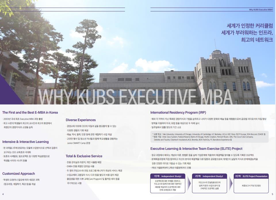 - Executive MBA는 경영진 및 중견 관리자를 위한 프로그램으로, 리더십 강화와 전략적 경영 역량을 배양할 수 있는 기회를 제공합니다.