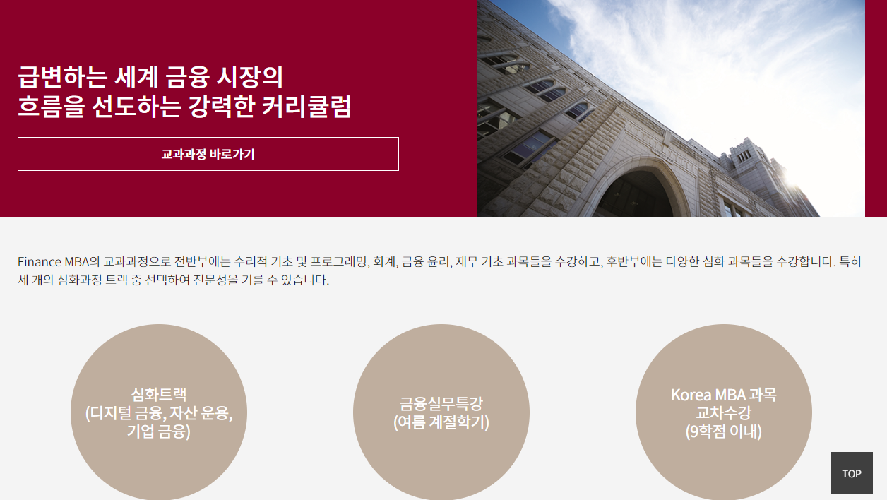 - Finance MBA는 금융 분야에 특화된 프로그램으로, 금융시장에서 요구되는 실무 능력을 키우고, 글로벌 금융 네트워크를 형성할 수 있습니다.