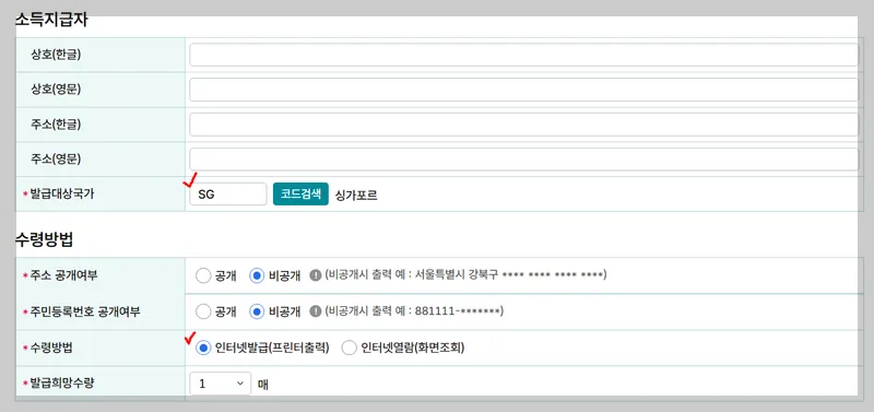 • 발급대상국가의 코드(SG 등)를 정확히 기입.