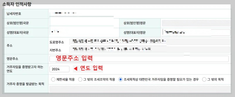 • 자동으로 입력된 기본 정보(이름, 주소, 주민등록번호 등)가 정확한지 확인하세요.