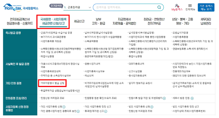 • 상단 메뉴에서 **‘국세증명 > 사업자등록 세금 관련 신청/신고’**를 선택.