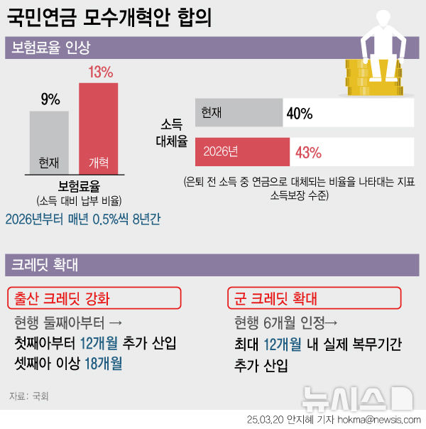 (image) 이번 국민연금 모수개혁안은 “더 내고 더 받는” 방식을 골자로 하고 있으며, 보험료율 인상과 소득대체율 인상, 크레딧 확대, 저소득층 지원 강화, 국가 지급보장 명문화 등의 내용을 포함한다. 위 그림은 국회에서 합의된 개혁안의 주요 내용을 요약한 인포그래픽으로, 현행 대비 변화되는 핵심 지표들을 보여주고 있다. 보험료율은 현행 9%에서 **개혁 후 13%**로 인상되고, 소득대체율은 현행 40%에서 43%로 상향되는 모습이며, 출산 및 군 복무 크레딧 확대 방안도 도식화되어 있다 (image). 이러한 개혁안 세부 사항을 하나씩 정리하면 다음과 같다: