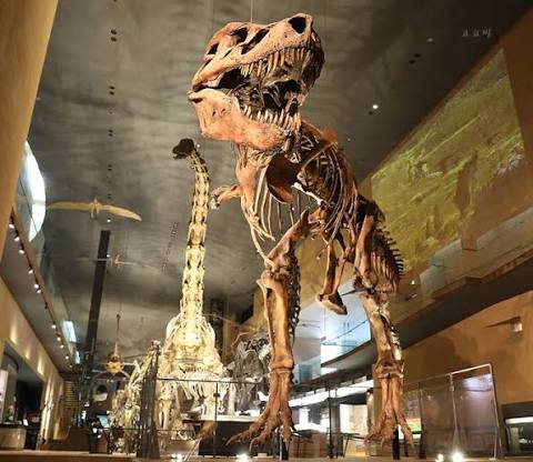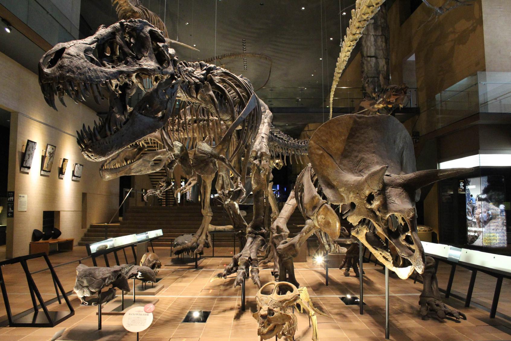 * 티라노사우루스 렉스 (Tyrannosaurus rex): 백악기 후기의 최상위 포식자인 티라노사우루스의 전신 골격이 역동적인 사냥 자세로 전시되어 있다. 이는 전 세계적으로 유명한 표본(예: Sue 또는 Stan 등)의 정밀 레플리카로 추정되며, 거대한 두개골과 강력한 뒷다리, 상대적으로 작은 앞다리의 해부학적 특징을 명확히 보여준다. 이 표본은 단순한 전시를 넘어 수각류 공룡의 생체 역학을 이해하는 데 중요한 시각 자료를 제공한다.