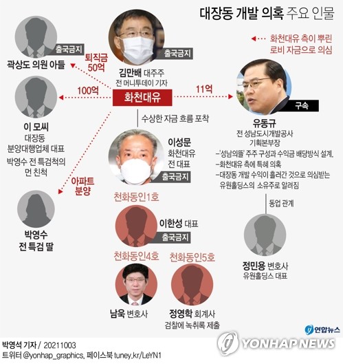• 2021년 10월: 수사 당국이 본격 수사에 착수. 사업 실무 책임자였던 유동규 전 성남도개공 기획본부장이 뇌물 수수 등의 혐의로 10월 초 구속되었습니다. 이어 화천대유 대주주 김만배 씨도 구속영장이 청구되어 10월 말경 구속되었고, 미국에 체류 중이던 민간사업자 남욱 변호사도 귀국 직후 체포되었습니다.