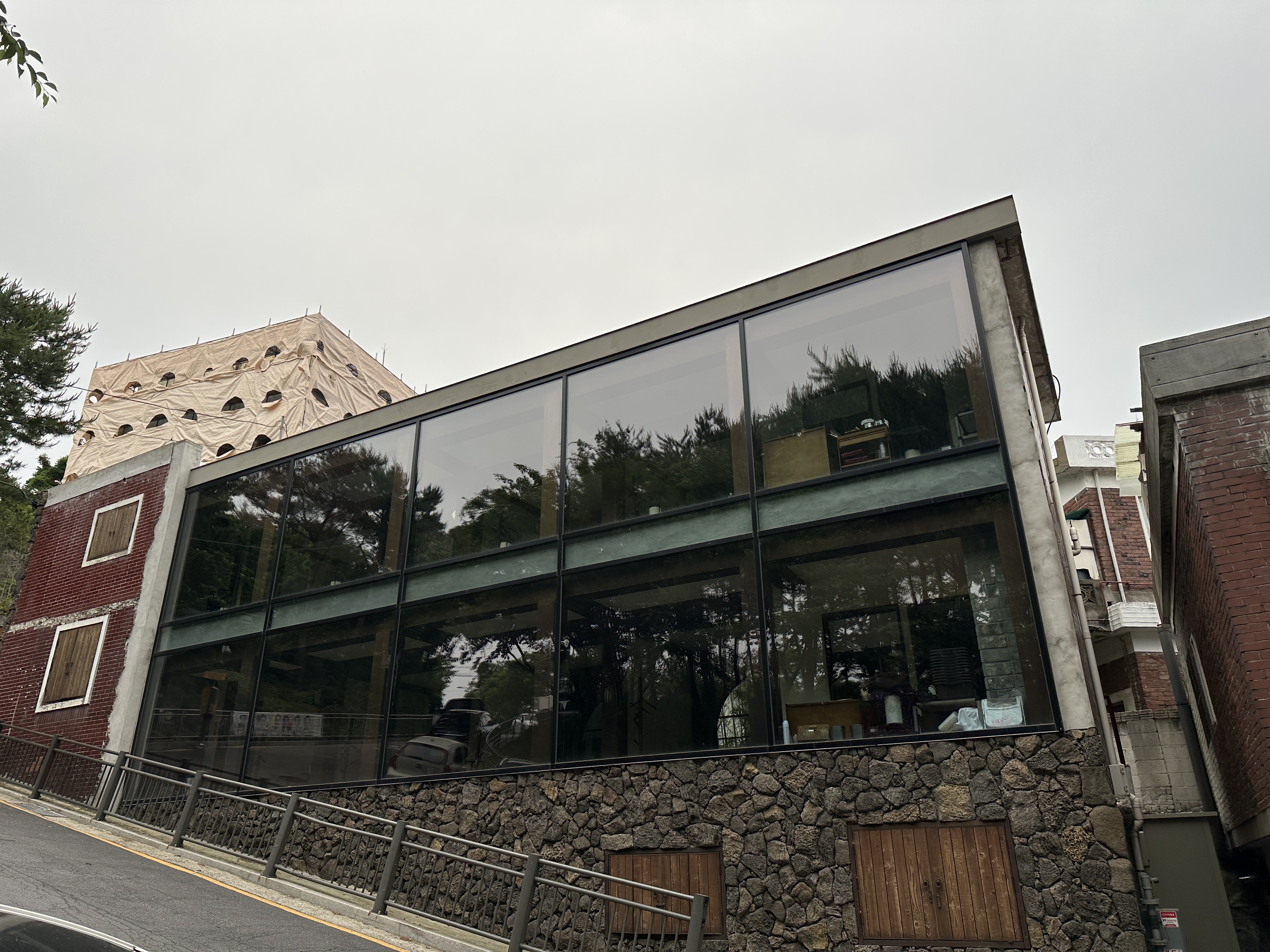 외관은 콘크리트, 화산석, 유리라는 세 가지 재료의 절제된 조합으로 구성되어 있습니다. 이 중 특히 눈에 띄는 것은 전면을 가득 메운 통유리입니다. 건물 안쪽에서 바라보면 나무가 유리 위에 그림자를 드리우고, 외부의 바람과 햇빛이 실내로 유영하듯 스며듭니다. 공간 자체가 끊임없이 변하는 스크린이자, 사유를 유도하는 창이 되는 구조입니다.