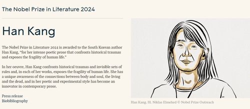 2024년, 한강은 노벨문학상을 수상하며 한국 문학사에 새로운 획을 그었습니다. 스웨덴 한림원은 한강의 문학을 “역사적 트라우마에 맞서고 인간 생의 연약함을 드러낸 강렬한 시적 산문”으로 평가하며 노벨문학상 수상자로 선정했습니다.