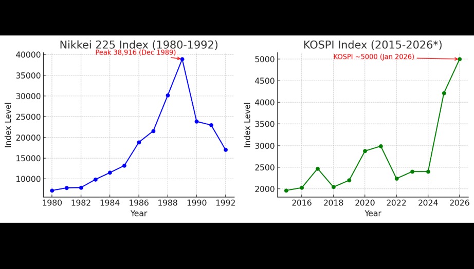 그림: 일본 1980년대 버블 시기 닛케이225 지수 vs. 한국 코스피지수의 지수 추이 비교 (좌: 닛케이 1980–1992, 우: 코스피 2015–2026). 닛케이는 1985~1989년 급등 후 1990년대 폭락했고, 코스피는 2025년 급등하여 2026년 1월경 5000에 도달한 시나리오를 가정하였다. 데이터 출처: 닛케이225 종가 , 코스피지수 역사적 자료 .