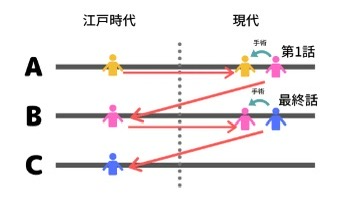 • 진(분홍 아이콘)은 자신이 원래 있던 과거로 되돌아가려 하지만, “다음 세계”인 B의 에도시대로 떨어진다.