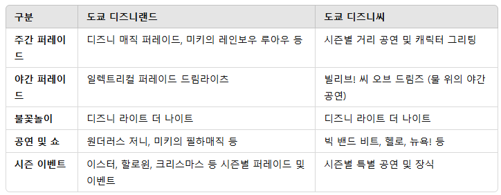 공연과 퍼레이드는 디즈니 파크의 큰 매력 중 하나입니다. 각 공원의 엔터테인먼트 프로그램을 비교해 보겠습니다.