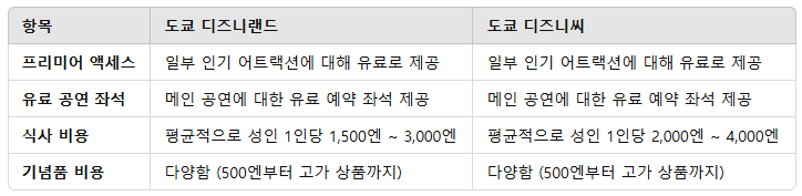 • 추가 비용: 디즈니씨는 고급 레스토랑과 성인 취향의 기념품이 많아 추가 지출이 더 많을 수 있습니다.