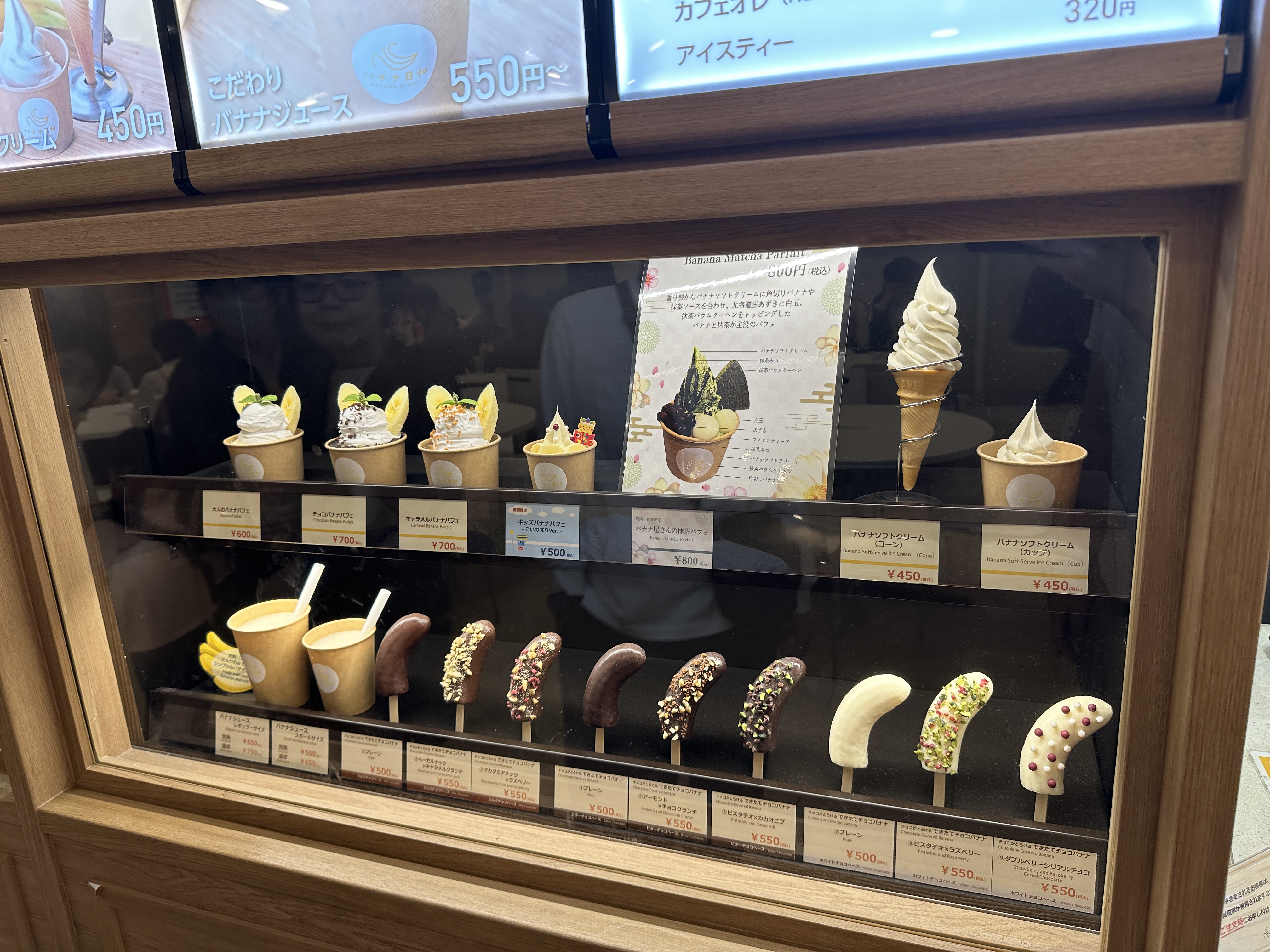 이처럼 가격은 한 개 450엔~550엔 정도이며, 주문을 받으면 그 자리에서 바나나에 초콜릿을 입히고 토핑까지 올려줘서 신선하고 바삭한 식감을 즐길 수 있습니다 . 진열대에 먹음직스럽게 줄지어 놓인 노란 바나나를 골라 만들기에 보는 재미도 있습니다.