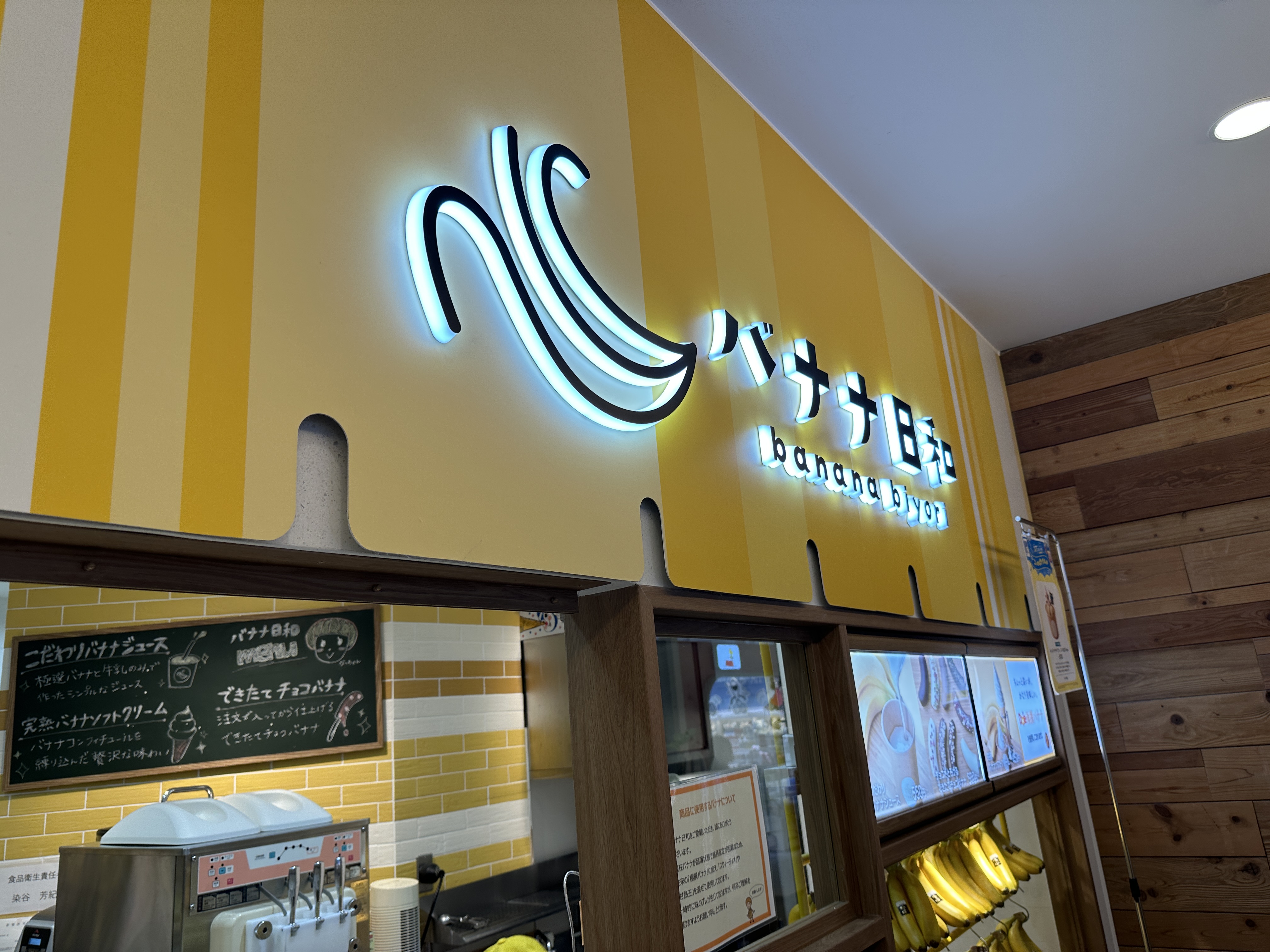 바나나日和는 도쿄 스카이트리 타운 소라마치 3층 “타베테라스” 푸드코트 안에 위치해 있습니다 . 스카이트리 타운은 도쿄 오시아게(押上) 역과 바로 연결된 대형 쇼핑몰로 관광객이 많이 찾는 장소이며, 바나나日和는 그중에서도 3층 푸드코트의 한 켠을 차지하고 있는 작은 디저트 스탠드형 매장입니다. 노란 바나나를 연상시키는 밝은 노란색 간판과 인테리어로 한눈에 들어오며, 가게 전면에 먹음직스럽게 익은 바나나들을 진열해 두어 시각적으로도 눈길을 끕니다. 매장 상단에는 귀여운 바나나 모양 로고와 「バナナ日和」라는 간판이 걸려 있어 멀리서도 알아보기 쉽습니다.