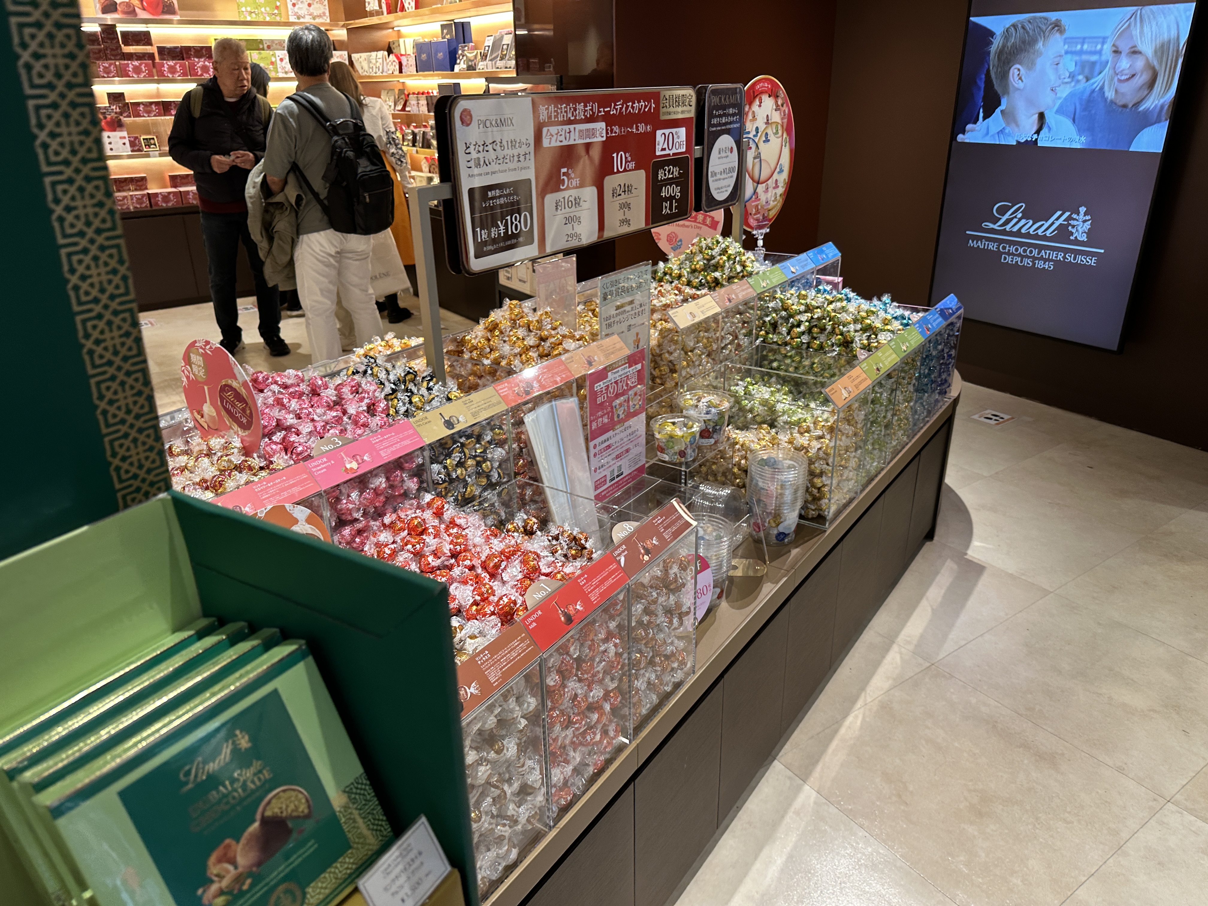 매장 내부는 비교적 넓고 깔끔하게 정돈되어 있어, 붐비는 시간대에도 동선이 크게 불편하지 않습니다. 한쪽 벽면에는 다양한 초콜릿 바와 기프트 세트, 린도르(LINDOR) 트뤼플 등의 베스트셀러 제품들이 가득 진열되어 있습니다. 또 다른 코너에는 사계절 혹은 기념일에 맞춘 한정판 상품이나 특별한 패키지들이 있어, 선물용 제품을 찾으려는 이들에게는 흥미로운 공간이 됩니다.