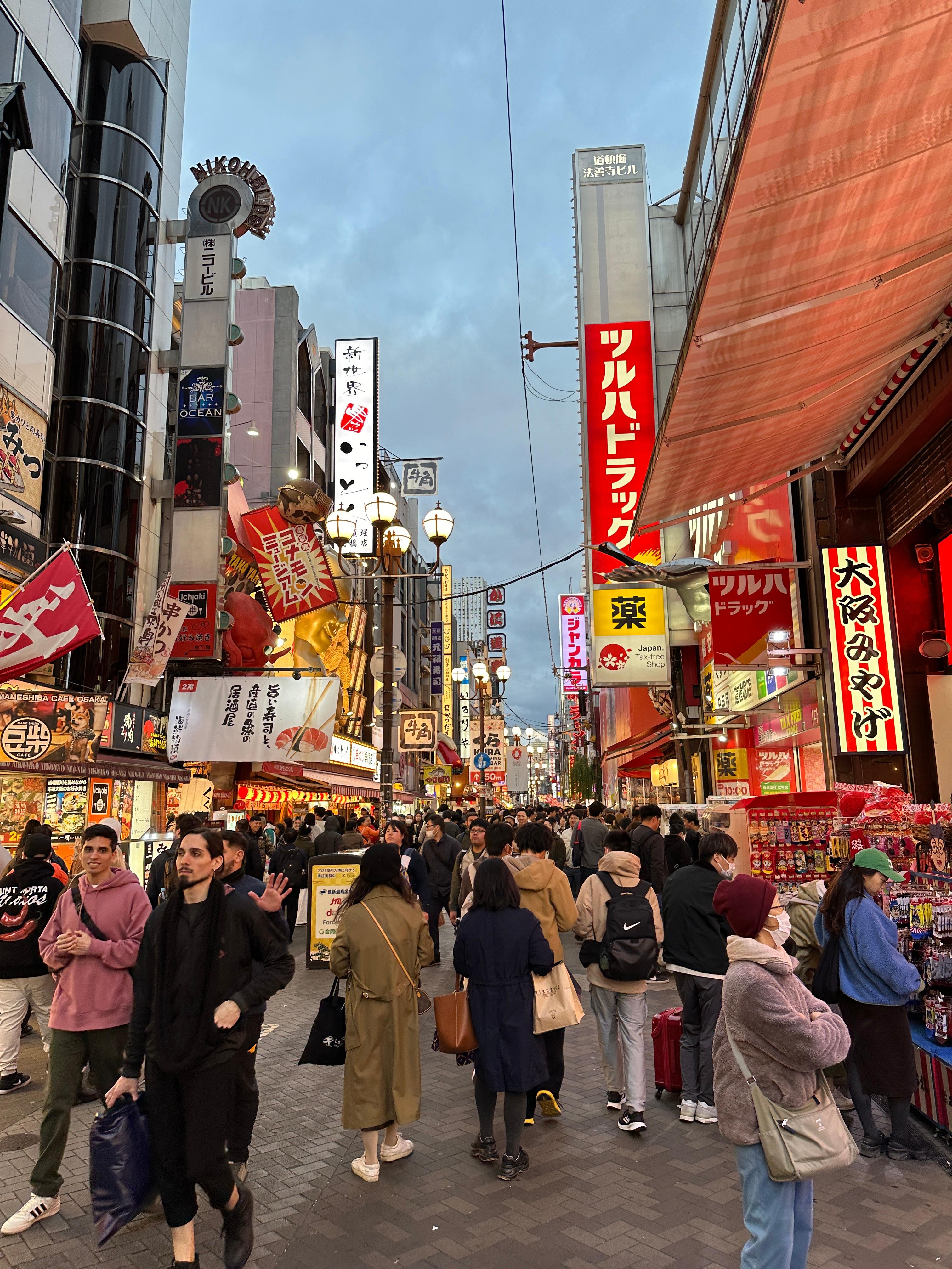 도톤보리, 신사이바시 등 번화가에서 길거리 음식을 즐기며 일본 특유의 활기찬 분위기를 경험할 수 있습니다.