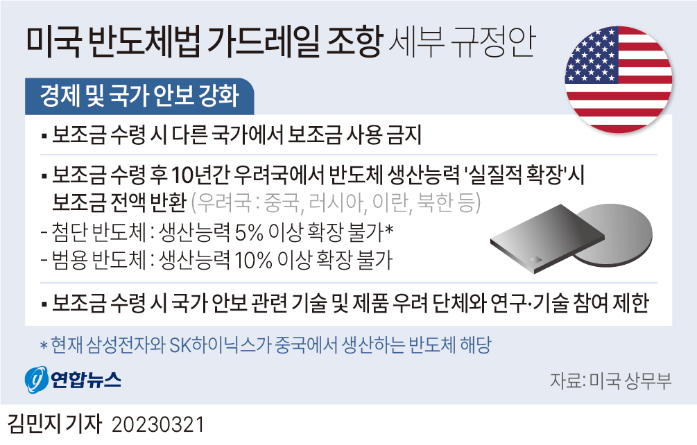 반도체법에는 보조금을 받는 기업이 동시에 중국 내 첨단 반도체 생산 능력을 과도하게 확장하지 못하도록 하는 규제 조항도 포함되어 있습니다. 최근 트럼프 행정부는 이러한 조건을 더욱 엄격하게 적용해, 보조금을 받은 후 중국에 투자한 기업들(예를 들어, 삼성전자의 낸드플래시 공장이나 SK하이닉스의 D램 공장)이 대상이 될 수 있다고 경고하고 있습니다.