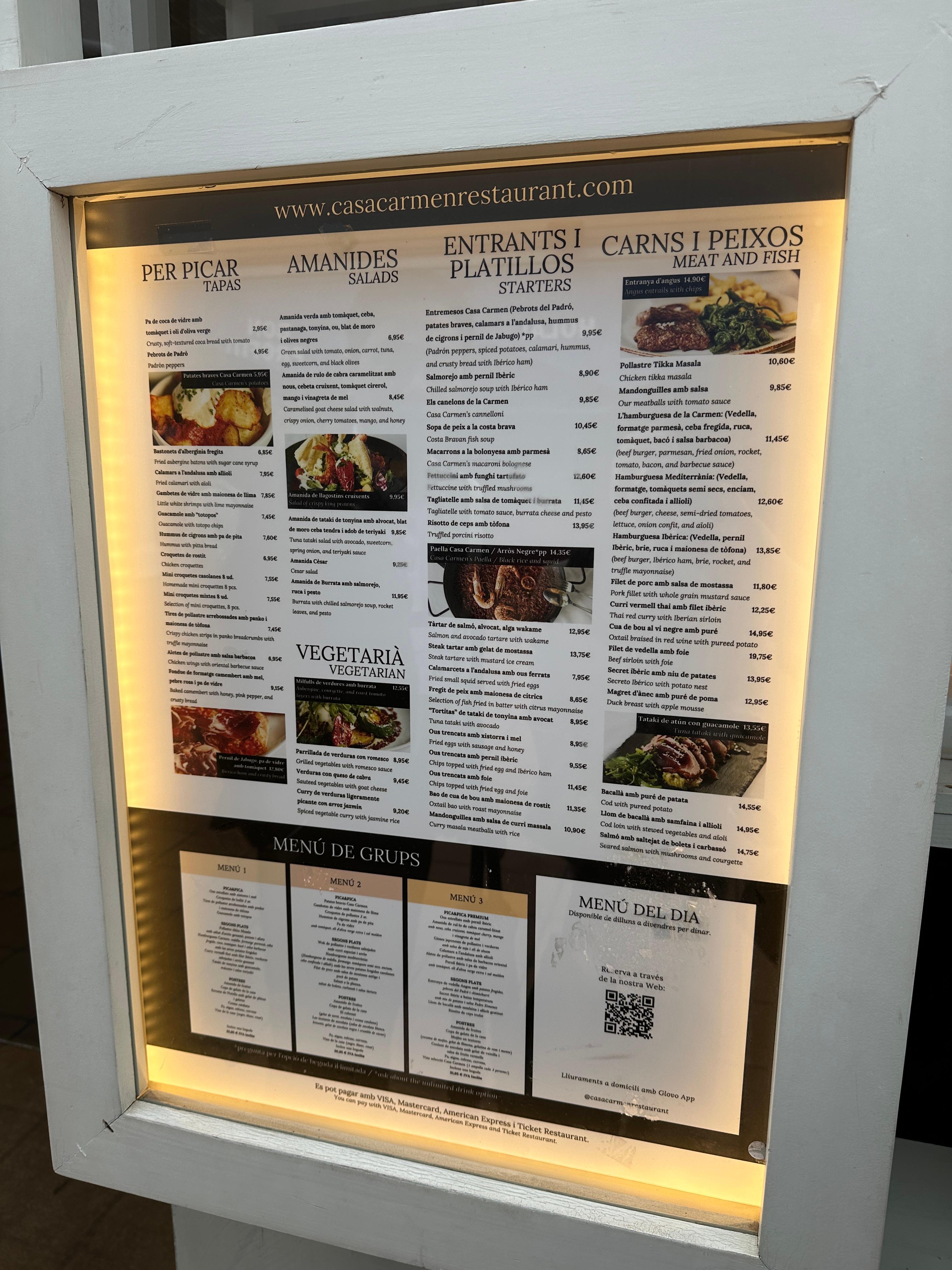 Casa Carmen은 전통 스페인 요리를 현대적인 감각으로 재해석하여 다양한 메뉴를 선보입니다. 메뉴판은 크게 여러 카테고리로 나뉘며, 가격이 명확하게 기재되어 있어 선택이 용이합니다.
