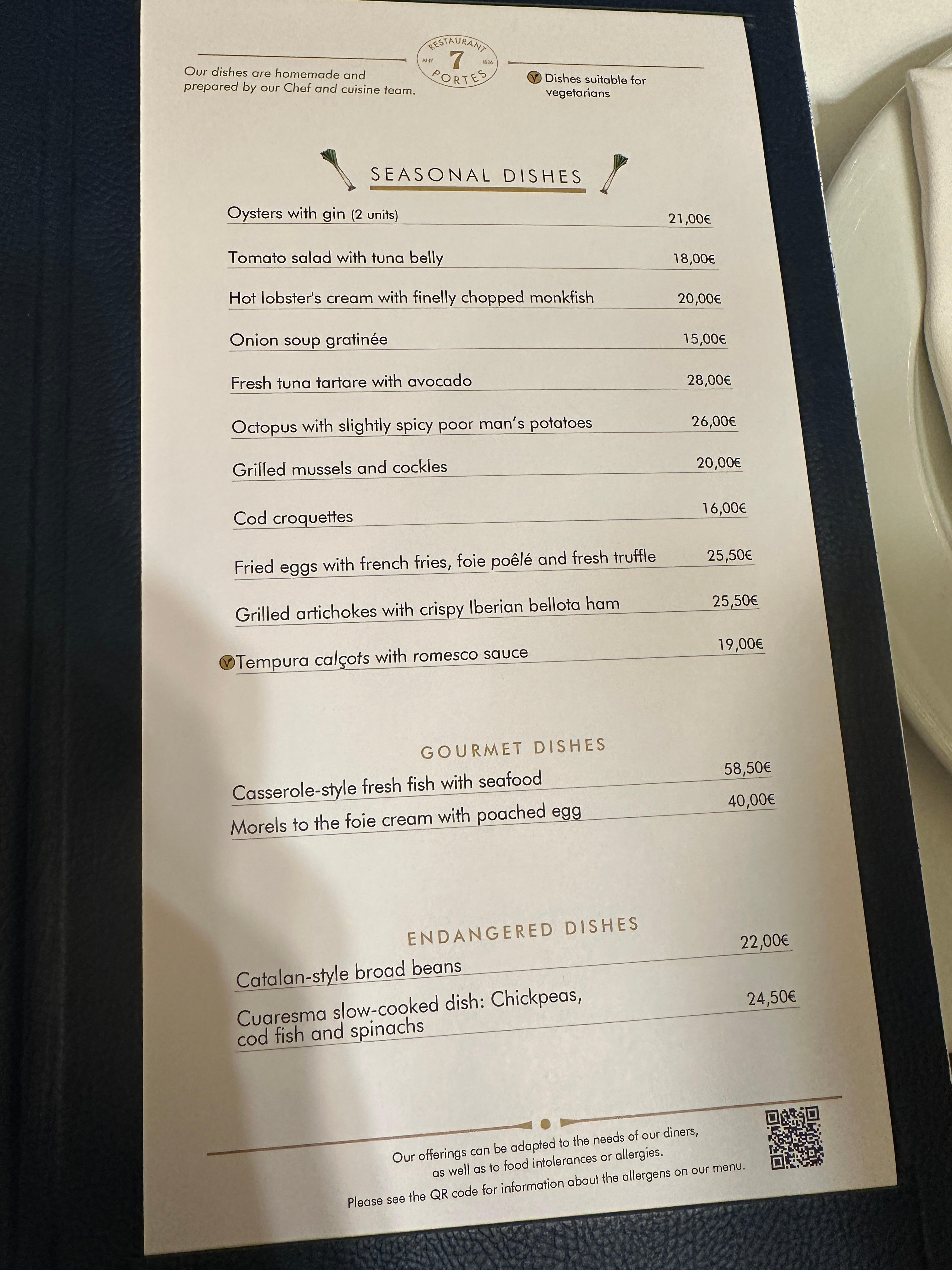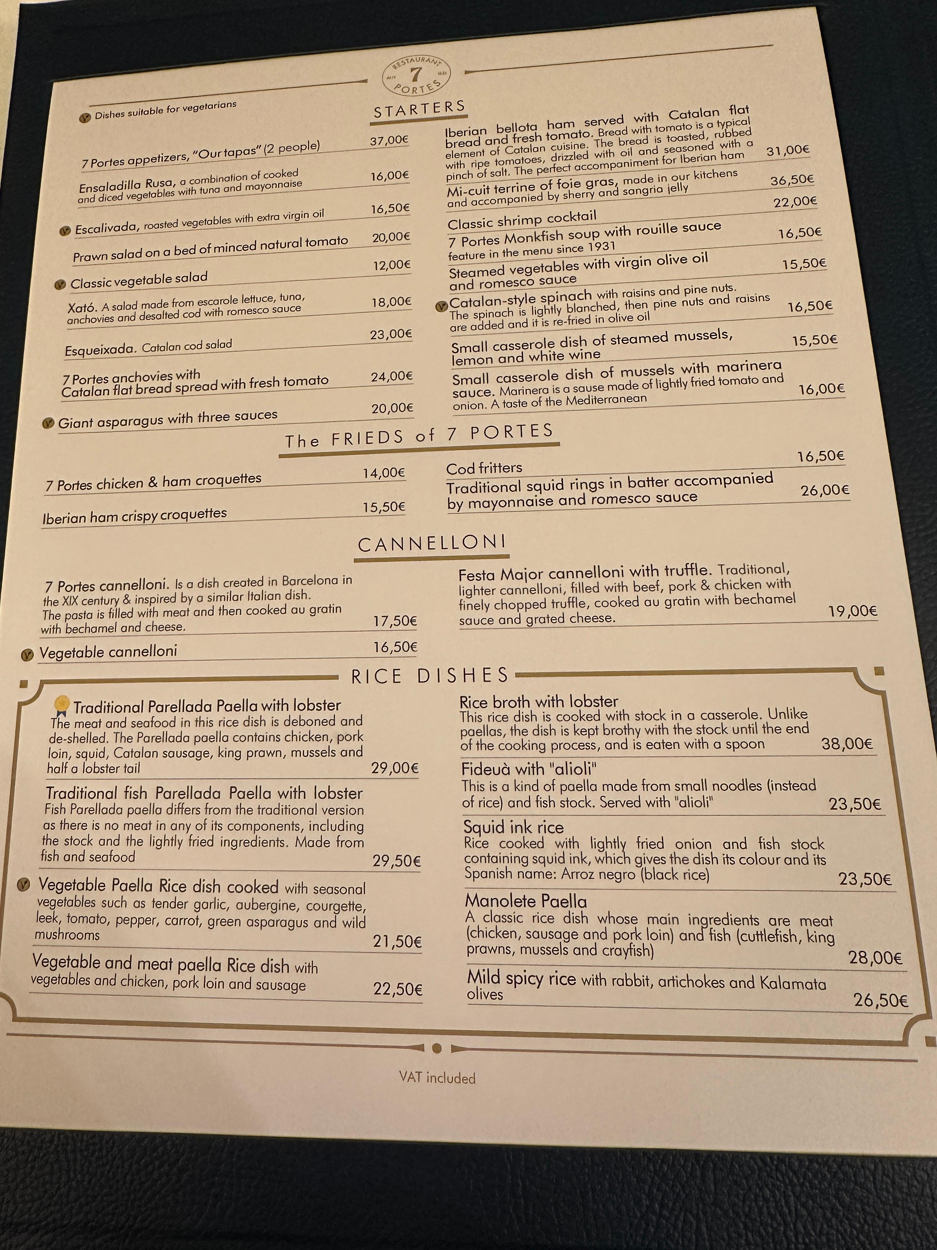• 1인당 예산: 전채나 사이드 12개, 메인 1개, 디저트 또는 음료까지 즐길 경우, 평균 40~60유로 정도를 예상하면 무난합니다. 여기에 랍스터 파에야나 고급 와인을 더한다면, 1인당 70~80유로 이상이 될 수도 있습니다.
