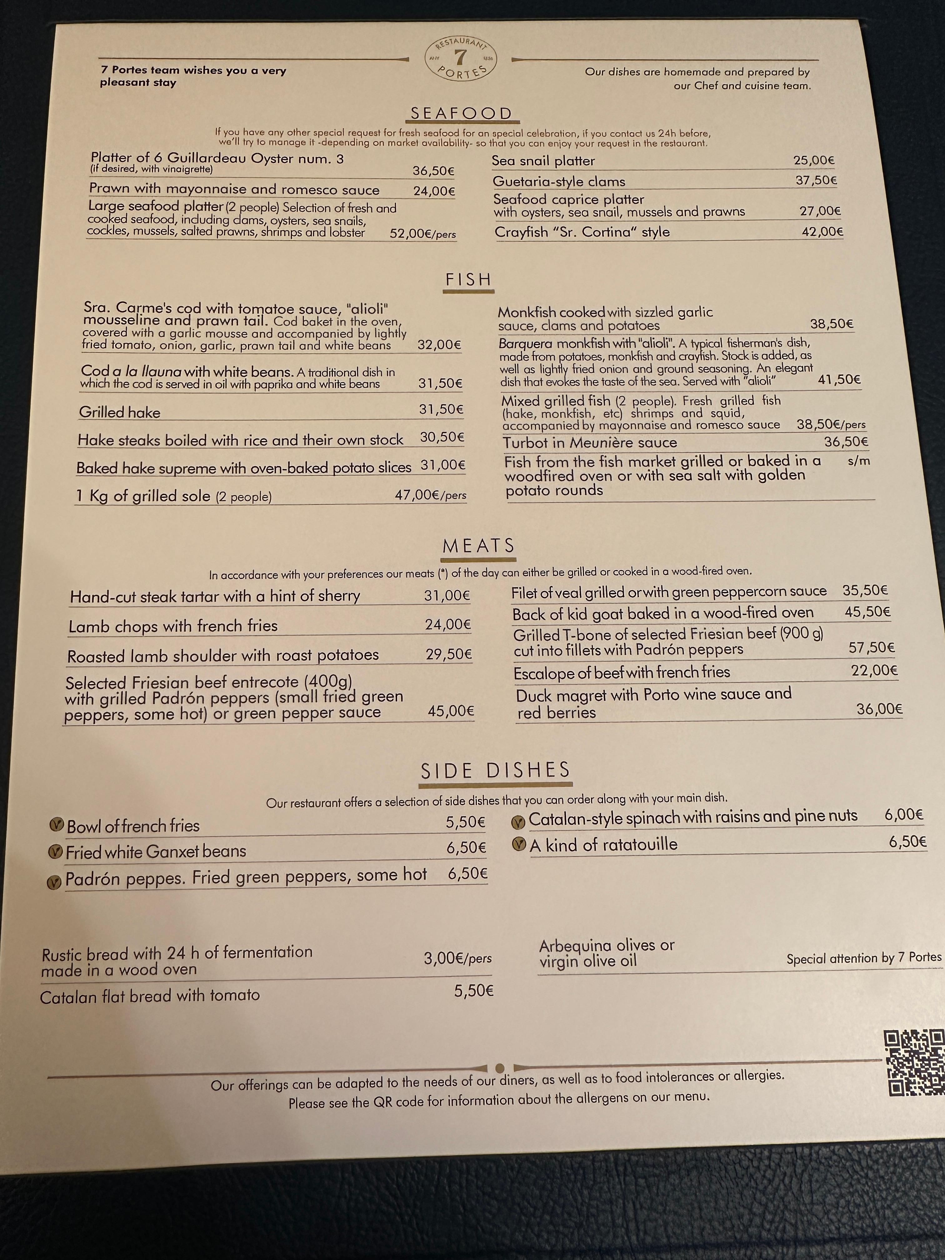 • 1인당 예산: 전채나 사이드 12개, 메인 1개, 디저트 또는 음료까지 즐길 경우, 평균 40~60유로 정도를 예상하면 무난합니다. 여기에 랍스터 파에야나 고급 와인을 더한다면, 1인당 70~80유로 이상이 될 수도 있습니다.