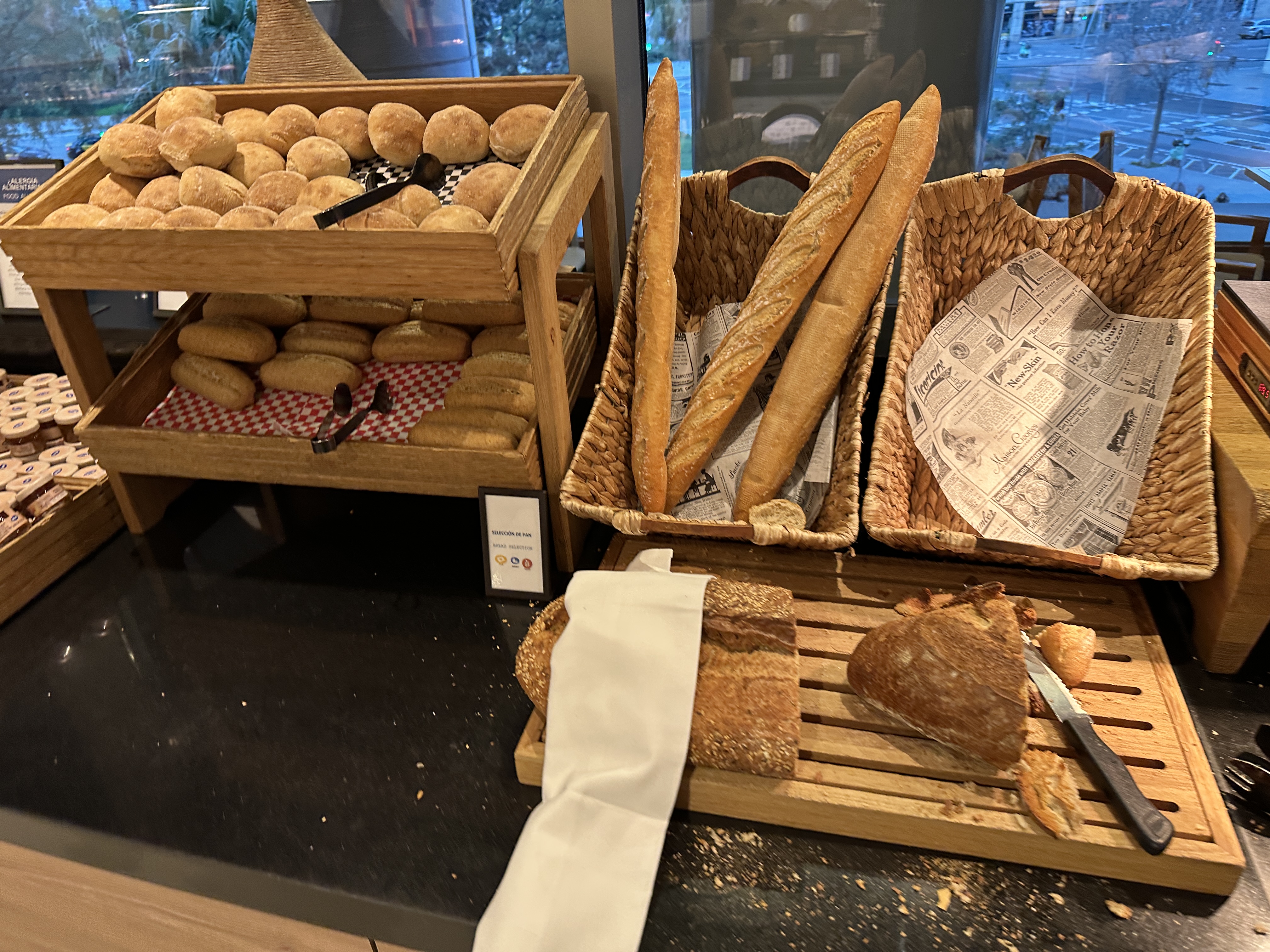 • 바게트, 치아바타, 롤빵, 그리고 통밀빵 등 여러 가지가 나무 바구니나 진열대에 가득 놓여 있어, 원하는 것을 골라서 맛볼 수 있습니다.