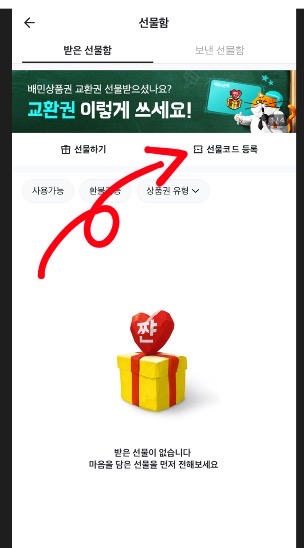 • ‘선물함’ 화면 중앙쯤에 보면 “선물코드 등록” 버튼이 있습니다.