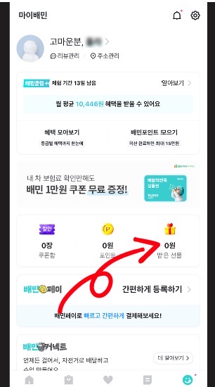 • ‘마이배민’ 화면에서 “받은 선물” 아이콘을 누르면 ‘선물함’ 화면으로 진입하게 됩니다.