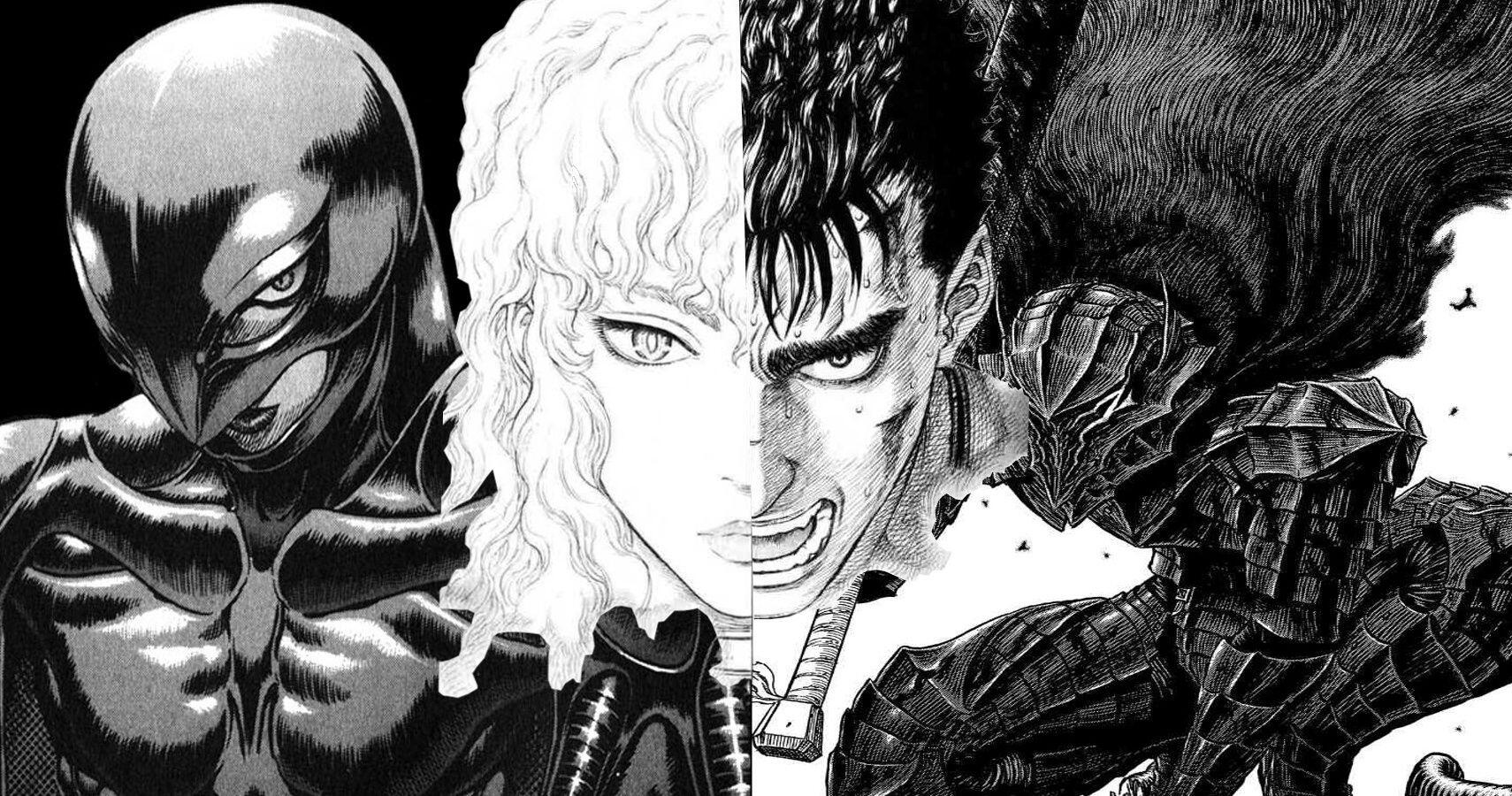 황금시대 – 영광과 균열: 매의 단은 가츠의 무훈에 힘입어 미드랜드와 튜더의 전쟁을 승리로 이끄는 등 영웅으로 떠오르고, 그리피스는 왕국의 신임과 공주 샬롯의 호감을 얻으며 꿈꾸던 입지를 다져갑니다. 그러나 그리피스의 “자신만의 꿈을 지닌 자만이 친구가 될 수 있다”는 신념을 우연히 엿듣게 된 가츠는 충격을 받고, 자신 역시 독자적인 꿈과 삶의 목적을 찾아야 진정한 동등한 동료가 될 수 있다고 깨닫습니다. 이에 가츠는 매의 단을 떠나기로 결심하고, 이를 만류하려는 그리피스와 재차 결투를 벌입니다. 1년 전 자신을 쓰러뜨렸던 그리피스를 이번에는 가츠가 단숨에 제압하고 떠나자, 그리피스는 가츠의 이탈에 큰 충격을 받아 순간적인 방심으로 공주와 밀회를 갖는 실수를 저지릅니다. 이 일로 그리피스는 반역죄로 체포되어 지하감옥에서 혹독한 고문을 당하고, 그의 부재 속에 매의 단은 왕국에 의해 역적으로 몰려 와해되고 맙니다.