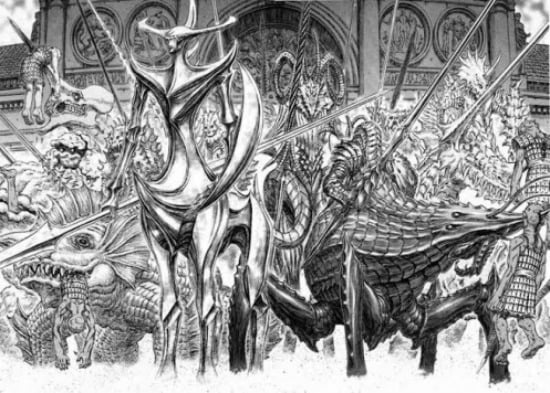 마침내 가츠 일행이 바다를 건너 엘프helm의 요정나라에 도착한 그 시기, 지상에서는 그리피스와 쿠샨 제국 황제 가니슈카의 최종 전투가 벌어집니다. 가니슈카가 초거대 마물로 변한 끝에 그리피스에게 토벌당하는 순간, 천계와 지상의 경계가 완전히 붕괴되어 버립니다. 이를 계기로 인간 세계와 환상계가 하나로 융합되는 대격변 **“환상세계(Fantasia)의 도래”**가 일어나, 엘프나 트롤, 용과 같은 존재들이 현실 전역에 나타나기 시작합니다. 그리고 그리피스는 마침내 꿈꾸던 거대한 **매의 제국 “팔코니아”**를 건설하여, 혼돈에 빠진 인류를 구원하는 빛의 영웅으로 칭송받으며 새로운 질서를 세웁니다 .