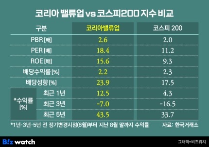 - 최근 1년 수익률: 코리아 밸류업 지수 12.5% vs 코스피200 지수 4.3%