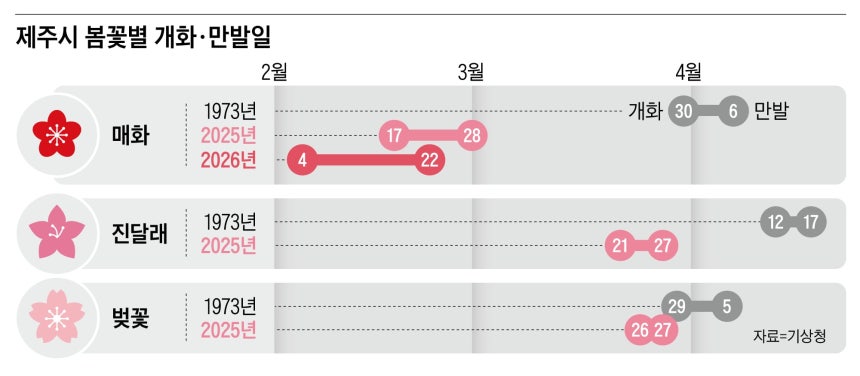 * 사라진 3월의 매화: 1970년대만 해도 3월 하순에 만발하던 제주 매화가 2020년대 들어서는 2월 초중순으로 훌쩍 당겨졌습니다. 서귀포는 이미 '1월의 꽃'이 되어버렸죠. 올해는 평년보다 무려 43일이나 일찍 만개했습니다.