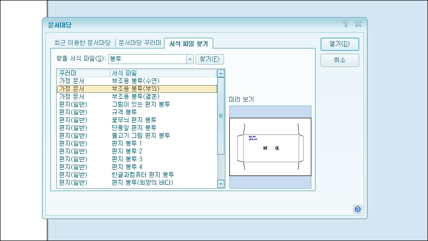 검색 창에 **'봉투'**를 입력하고, '부조용 봉투(부의)' 양식을 선택합니다.