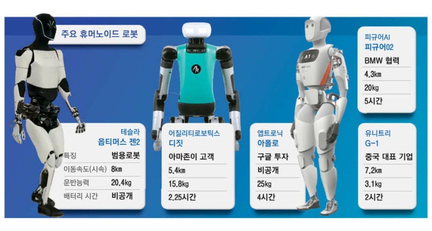 • 아마존: 직접 휴머노이드를 만들지는 않지만, 어질리티로보틱스와 협력해 물류창고용 로봇 등을 테스트하며 간접 참여하고 있습니다.