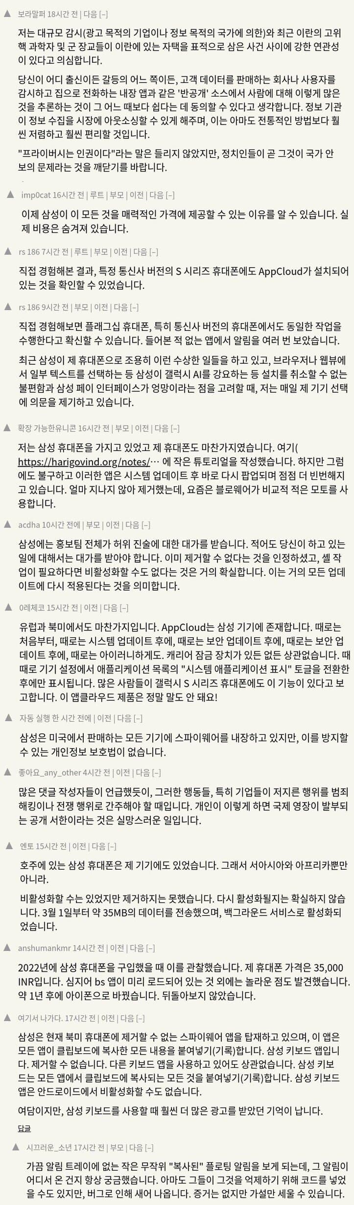 요컨대 이번 AppCloud 스캔들로 삼성전자에 대한 소비자 신뢰가 급격히 추락했습니다. “세계 2위 스마트폰 기업이 설마 뒤에서 이런 짓을?” 하는 충격과 함께, 앞으로 삼성 기기를 계속 써도 될지 의구심을 표하는 이들이 늘어나고 있습니다. 과거부터 스마트폰 제조사들의 블롯웨어 관행에 불만이 많던 사용자들은 “역시나 삼성도 똑같다”거나 “이제 믿을 회사가 없다”는 반응으로 허탈함을 드러냈습니다. 일부는 노골적으로 “다음에는 다른 브랜드로 갈아타겠다”는 의견을 밝히고 있어, 충성 고객층까지 흔들릴 수 있는 상황입니다.
