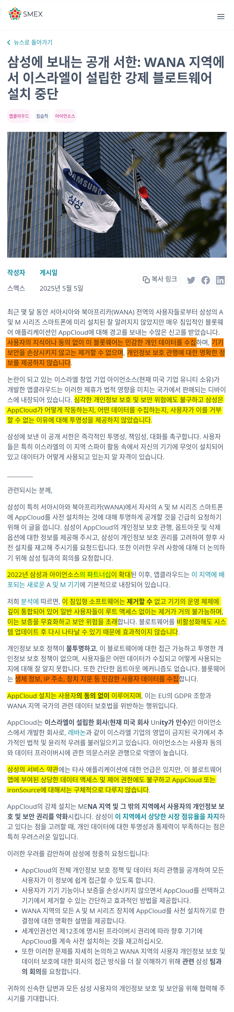 최근 삼성전자 중저가 스마트폰 사용자들 사이에서 이스라엘 기업 ironSource의 계열 앱인 AppCloud에 관한 논란이 뜨겁습니다. 이 앱은 서아시아·북아프리카(WANA) 등 일부 지역의 갤럭시 기기에 사용자 동의 없이 숨어 설치되어 민감 정보를 몰래 수집하고 있는 것으로 드러났습니다  . 일반 소비자 입장에서 이 사태는 어떤 구조로 벌어지고 있으며, 왜 큰 문제가 되고 있을까요? 또 이에 대한 전 세계 이용자들의 반응과 삼성전자의 대응, 그리고 경쟁사들이 얻는 반사이익은 무엇인지 살펴보겠습니다. 마지막으로 무너진 신뢰를 되찾기 위해 삼성전자가 취해야 할 조치도 제언합니다.