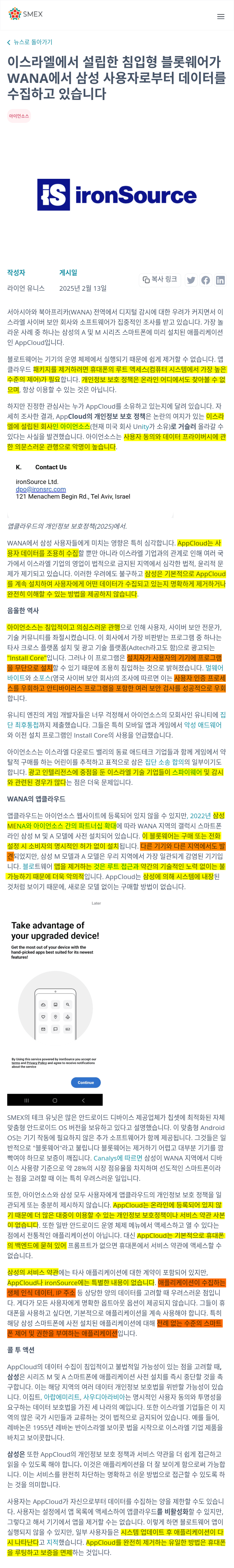 최근 삼성전자 중저가 스마트폰 사용자들 사이에서 이스라엘 기업 ironSource의 계열 앱인 AppCloud에 관한 논란이 뜨겁습니다. 이 앱은 서아시아·북아프리카(WANA) 등 일부 지역의 갤럭시 기기에 사용자 동의 없이 숨어 설치되어 민감 정보를 몰래 수집하고 있는 것으로 드러났습니다  . 일반 소비자 입장에서 이 사태는 어떤 구조로 벌어지고 있으며, 왜 큰 문제가 되고 있을까요? 또 이에 대한 전 세계 이용자들의 반응과 삼성전자의 대응, 그리고 경쟁사들이 얻는 반사이익은 무엇인지 살펴보겠습니다. 마지막으로 무너진 신뢰를 되찾기 위해 삼성전자가 취해야 할 조치도 제언합니다.