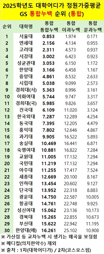 이러한 중차대한 시기에, 공신력 있는 '대학어디가'의 데이터와 입시 분석 기관 '코스모스핌'의 자료를 교차 검증하여 산출된 'GS 통합누적백분위(통합누백) 기준 정원가중평균' 순위는 현시점의 대학별 합격선 판도를 가늠할 수 있는 가장 유의미하고 객관적인 지표 중 하나입니다. 본고에서는 해당 자료를 토대로 2025학년도 주요 대학들의 입시 결과를 예측하고, 구간별 특징과 거시적 흐름을 심층적으로 조망하고자 합니다.