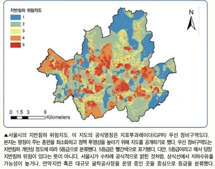 • 이 지도는 서울시 25개 구 전체를 대상으로, 지반 특성, 지하수위 변화, 지하시설물(지하철·상하수도 등), 공동(空洞) 발생 이력 등을 종합적으로 반영하여 1~5등급(색상 분포)으로 나타낸 것입니다.