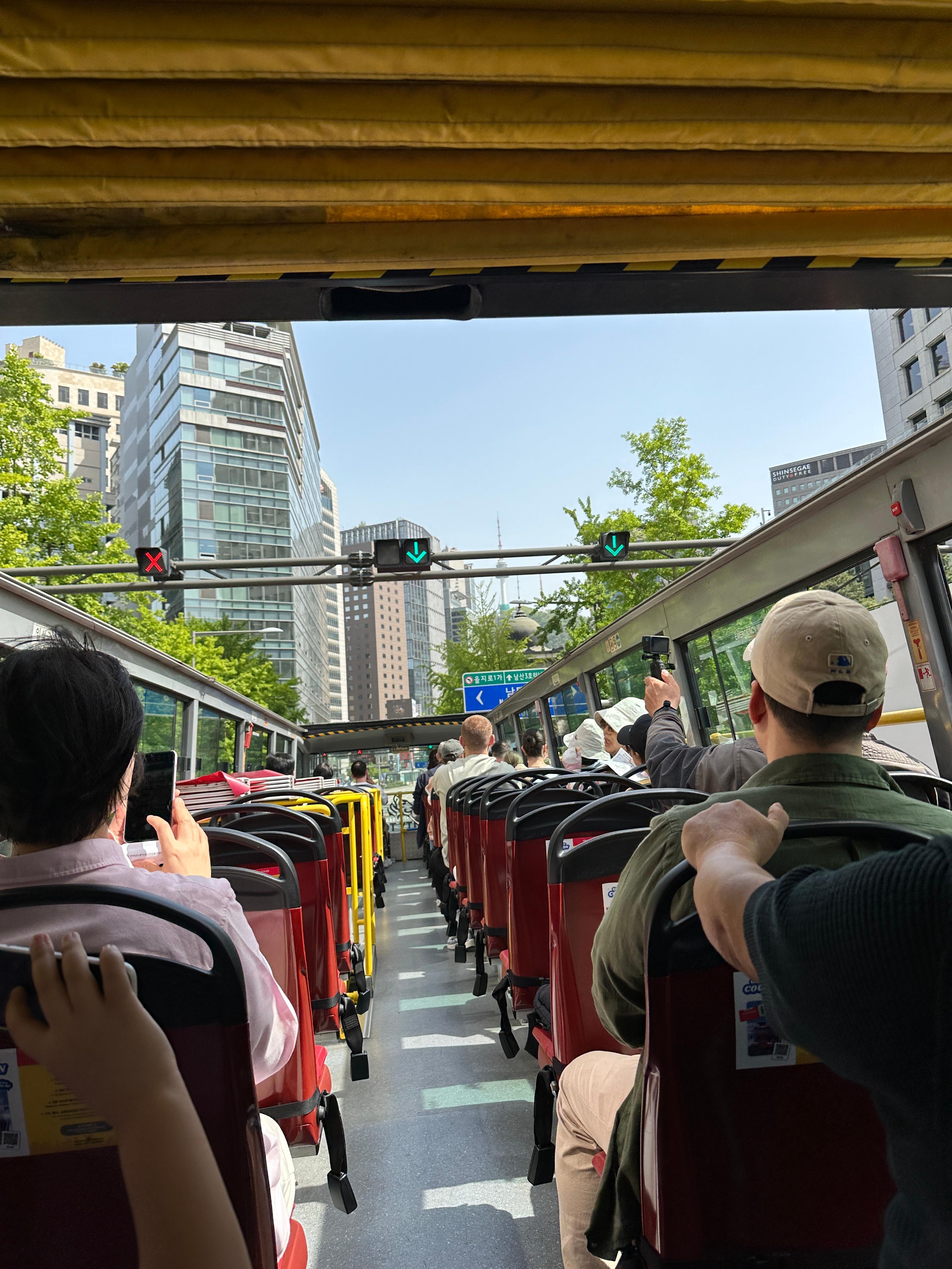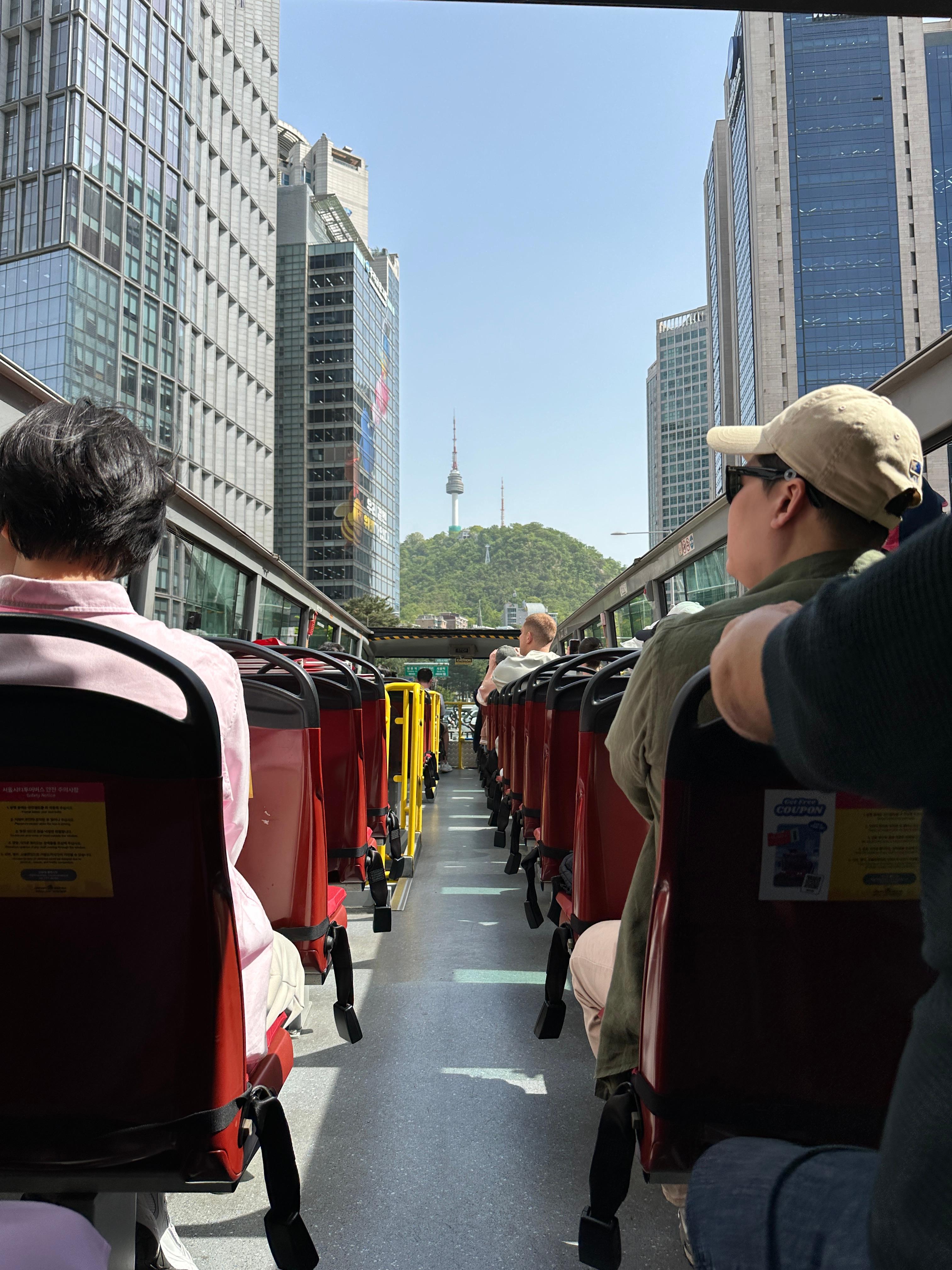 남산에서 바라본 서울 전경: 남산 N서울타워 부근에서는 버스가 언덕을 오르기 때문에 서울 도심을 한눈에 내려다볼 수 있는 탁 트인 전망이 펼쳐집니다. 초록이 우거진 남산 숲 너머로 보이는 빽빽한 빌딩숲과 저 멀리 북한산 능선까지 시야에 들어와, 서울이 얼마나 거대한 도시인지 실감하게 되는 장관이었습니다. 특히 맑은 날에는 하늘과 도시 풍경이 어우러져 사진 찍기에도 최적이며, 버스 투어 중 만나는 하이라이트 장면 중 하나라고 할 수 있습니다. 움직이는 버스에 앉아 이렇게 멋진 서울 전경을 감상할 수 있다는 점이 인상적이었고, 이 순간은 여행의 잊지 못할 추억으로 남았습니다.