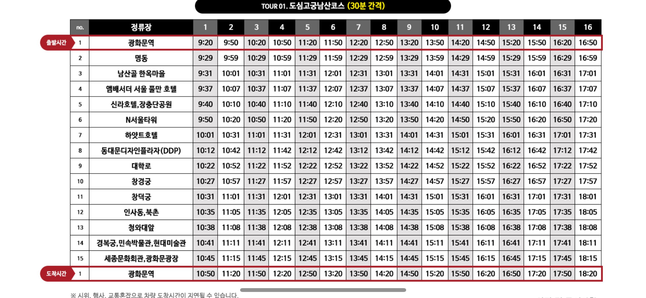 • 첫차: 오전 9시 20분 (광화문 광장 정류장 출발)