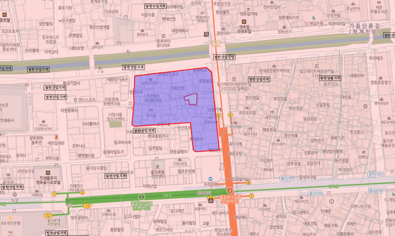 도로망: 해당 부지는 청계천로와 을지로가 만나는 지점에 위치해 있습니다 . 청계천로를 통해 서쪽으로 광화문·시청 방면, 동쪽으로 동대문 방면 진출입이 쉽고, 을지로를 따라 서쪽으로 남대문·서울역, 동쪽으로 왕십리 방면으로 연결됩니다. 또한 남측 인근에 퇴계로, 북측에 종로 등이 평행해 있어 차량을 통한 이동도 편리한 편입니다. 다만 도심 한복판인 만큼 출퇴근 시간대 차량 정체는 발생할 수 있습니다.