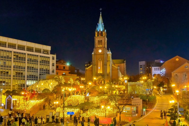 • 성당 건물 자체가 유럽풍의 고풍스러운 건축 양식을 지니고 있어, 주변에 설치된 크리스마스 장식과 함께 특별한 분위기를 느낄 수 있습니다.