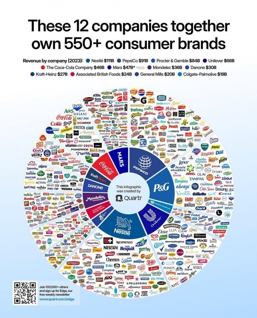 FMCG(Fast-Moving Consumer Goods) 분야의 세계적 기업들은 식음료, 생활용품, 화장품 등 소비재 시장에서 지배적인 영향력을 행사하고 있으며, 미국과 유럽에 본사를 둔 기업들이 대부분을 차지한다. 매출 규모 기준으로 살펴보면, 2023년 현재 **네슬레(Nestlé)**가 약 944억 달러 매출로 세계 최대 소비재 기업의 자리를 지켰고 , 그 뒤를 미국의 펩시코(PepsiCo) (약 860억 달러)와 프록터앤드갬블(P&G) (약 760억 달러) 등이 잇고 있다 . 영국-네덜란드계 생활용품 기업 **유니레버(Unilever)**도 약 630억 달러 매출로 상위권에 있으며 , 미국의 코카콜라(Coca-Cola) (약 430억 달러)와 프랑스의 로레알(L’Oréal) (약 390억 달러) 등이 글로벌 소비재 시장을 선도하고 있다  . 이러한 톱12 FMCG 그룹을 살펴보면 미국 기업이 절반 이상을 차지하며 (예: P&G, PepsiCo, Coca-Cola, Mondelez, Kimberly-Clark 등), 유럽 기업들도 네슬레(스위스), 유니레버(영국/네덜란드), 로레알·다논(프랑스) 등 다수를 차지한다  . 대륙별로 보면 북미와 유럽 기업들이 소비재 산업을 양분하고 있으며, 이들 다국적 기업 산하에 수백 개의 브랜드가 편입되어 전 세계 소비자 시장을 장악하고 있다. 예를 들어 네슬레는 커피(Nescafé), 생수(Perrier), 유아식 등 다양한 식품 브랜드 포트폴리오로 세계 식품시장에서 영향력이 절대적이며 , P&G는 기저귀(Pampers), 세제(Tide), 면도날(Gillette) 등 가정용품 분야의 다수 글로벌 브랜드를 거느리고 있다. 미국과 유럽 본사의 상위 12개 소비재 그룹이 전 세계 소비재 시장을 주도하고 있으며, 중국이나 신흥국 출신의 글로벌 FMCG 거대기업은 아직 나타나지 않고 있는 분포를 보인다.
