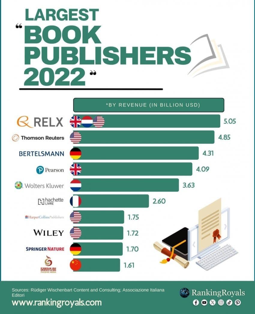 출판 산업에서는 학술·교육 및 미디어 부문의 대형 출판사들이 상위를 차지하고 있으며, 영미권과 유럽 기업들의 강세가 두드러진다. 세계 매출 1위 출판사는 영국-네덜란드계의 **렐렉스 그룹(RELX, 옛 Reed Elsevier)**으로, STM(과학기술의학) 출판과 데이터베이스 사업을 통해 연매출 약 63억 달러에 이르는 거대 출판사다 . 2위는 캐나다계 기업인 **톰슨 로이터(Thomson Reuters)**로, 법률·금융 정보출판 부문 중심으로 60억 달러대 매출을 올리며 RELX와 어깨를 나란히 하고 있다 . 그 다음은 독일의 미디어그룹 **베르텔스만(Bertelsmann)**으로, 산하에 세계 최대 무가지 출판사 펭귄 랜덤하우스(PRH)를 거느리고 있어 교육출판 부문 등을 합쳐 약 60억 달러 매출로 3위를 차지했다 . 4~5위권에는 영국의 피어슨(Pearson) 및 네덜란드의 볼터스 클루вер(Wolters Kluwer) 등 주로 교육·전문정보 출판사가 랭크되어 있고, 프랑스의 **아셰트(Hachette Livre)**도 Vivendi 그룹 산하에서 세계 6위 규모를 유지하고 있다  . 일본의 출판 영향력도 무시할 수 없는데, 일본의 슈에이샤·쇼가쿠칸 등이 속한 히토츠바시 그룹이 통합 매출 약 22.5억 달러로 2023년 세계 7위권으로 올라섰다 . 미국의 경우 **와일리(John Wiley & Sons)**나 하퍼콜린스(HarperCollins) 등이 각각 8위, 9위권에 위치해 있으나, 전체적으로는 영국/네덜란드, 독일, 프랑스 등 유럽 출판사들과 미국계 출판사들이 세계 상위권을 양분하고 있다  . 이러한 상위 기업들은 학술논문, 교과서, 베스트셀러 도서부터 만화에 이르기까지 지식·문화 콘텐츠 유통을 글로벌하게 장악하고 있으며, 특히 영어권 시장을 기반으로 한 영미권 출판사들의 수익 규모가 가장 크다. 국가별로 보면 영국(RELX, Pearson 등)과 미국(Wiley, HarperCollins), **독일/프랑스(Bertelsmann, Hachette)**의 5개국이 세계 출판 상위 10대 기업 대부분을 배출하고 있으며, 한국이나 중국의 출판사는 아직 글로벌 톱10에 진입하지 못한 상태다. 요약하면, 출판산업의 정점에는 영국, 미국, 독일, 프랑스 등 서방 국가의 대형 출판사들이 포진해 있으며, 이들이 언어와 시장을 무기로 문화·지식 흐름에 지대한 영향을 미치고 있다.