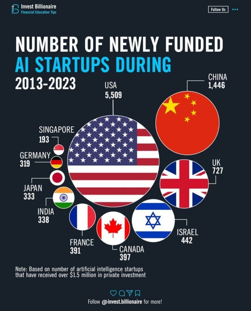 지난 10년간 AI 열풍과 함께 AI 스타트업에 대한 투자 유치 동향을 보면, 미국이 단연 선두임을 알 수 있다. 2013년부터 2023년까지 전 세계에서 1,500만 달러 이상 투자 받은 AI 스타트업 약 10,095개 중 미국에 본사를 둔 스타트업이 5,509개로 전체의 절반 이상을 차지했다  . 중국은 1,446개의 AI 스타트업으로 두 번째로 많았으며, 그 뒤를 영국(727개), 이스라엘(442개), 캐나다(397개) 등이 잇고 있다 . 미국은 민간 부문의 AI 투자액만 20132024년 합계 4,700억 달러에 이르러 2위 중국(1,190억 달러)을 크게 앞질렀으며  , 2024년 한 해 동안에도 미국에서만 1000억 달러가 넘는 민간자본이 AI에 투입되었다. 이처럼 미국은 거대 IT기업들의 공격적 투자와 활발한 스타트업 생태계를 기반으로 AI 혁신을 선도하고 있다. 중국 역시 정부 차원의 지원과 BAT(바이두, 알리바바, 텐센트) 등의 투자를 통해 빠르게 따라가고 있는데, 20192023년 중국 정부의 AI 투자만 1,330억 달러에 달하고 AI 논문·특허 건수에서는 미국을 앞서는 등 연구 면에서 격차를 줄여가는 추세다  . 영국은 AI 스타트업 수 3위국으로, 딥마인드(DeepMind) 등 세계적 AI 연구회사를 배출했고 2013~2023년 정부가 약 260억 달러를 AI에 지출하는 등 공격적인 육성 정책을 펴고 있다 . 이 외에도 이스라엘, 캐나다, 프랑스, 인도, 일본, 싱가포르 등이 AI 신생기업 다수 배출국으로 뒤를 잇고 있는데, 이들 국가는 각기 강점 분야(AI 보안, 음성·영상 인식 등)를 바탕으로 독자적인 스타트업 생태계를 구축 중이다 . 전반적으로 2010년대부터 2023년까지의 AI 투자 동향은 미국과 중국의 양강 체제 속에, 영국·이스라엘 등 기술 선진국들이 틈새 두각을 나타내는 형국이며, AI 인재와 자본이 소수 상위국에 집중되는 추세가 뚜렷하다.