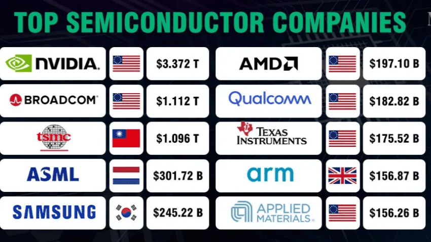 반도체 산업에서는 미세공정 기술과 설계능력을 겸비한 선도 기업들이 글로벌 IT의 근간을 제공하고 있다. 우선 **TSMC(Taiwan Semiconductor Manufacturing Co.)**는 세계 파운드리(반도체 위탁생산) 시장의 과반 이상을 점유하며 독보적인 1위를 달리고 있다. 2023년 3분기 기준 TSMC의 글로벌 파운드리 시장점유율은 **57.9%**에 달했고, 2024년 들어서는 60~70%대까지 올라 더욱 격차를 벌였다 . **삼성전자(Samsung Electronics)**는 파운드리 2위(점유율 10% 초중반대)이자 메모리 반도체(DRAM, NAND) 분야 세계 1위 제조사로, 메모리 기술에서 독보적 경쟁력을 보유하고 있다 . **엔비디아(Nvidia)**는 GPU(그래픽처리장치) 설계 부문에서 압도적 1위 기업으로, 최근 AI 붐으로 시가총액 1조 달러를 돌파하며 2024년 말에는 아마존·구글을 제치고 세계 시총 3위권에 오르기도 했다 . AI 연산에 필수적인 고성능 반도체 수요가 폭발하면서 엔비디아는 AI 시대의 최대 수혜기업으로 급부상했고, 데이터센터 및 자율주행용 칩 설계에서 선도적 지위를 유지하고 있다. ASML은 네덜란드에 본사를 둔 반도체 장비 업체로, 가장 첨단 공정에 필요한 EUV 노광장비를 전 세계에서 유일하게 공급하는 기업이다. 사실상 EUV 리소그래피 장비 시장을 독점하고 있는 ASML의 세계 시장점유율은 90%를 넘기며, 시가총액도 2024년 기준 3,000억 유로를 돌파해 네덜란드 역사상 최대 규모 기업이 되었다  . 이처럼 TSMC(파운드리), 삼성전자(메모리), 엔비디아(설계), **ASML(장비)**로 대표되는 반도체 리더들은 각자 산업의 필수 영역을 책임지고 있다. 이외에도 **인텔(Intel)**은 x86 CPU 설계·제조를 이끌어온 거목이며, AMD와 퀄컴(Qualcomm), 미디어텍(MediaTek) 등 팹리스(fabless) 설계 기업들도 모바일·통신용 칩 시장에서 큰 영향력을 행사한다. 반도체 산업은 고도의 전문화된 글로벌 분업체계로 이루어져 있으며, 소수 선도기업들이 설계-제조-장비-재료 등의 각 분야 핵심기술을 장악하여 전 세계 IT 산업의 성장을 견인하고 있다.