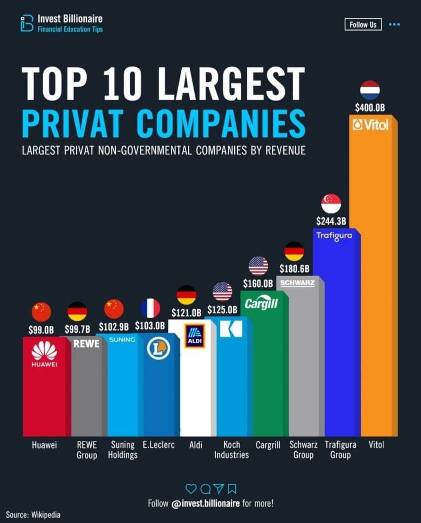 전 세계 매출 기준으로 가장 규모가 큰 민간 비상장 기업들은 주로 에너지·원자재 및 식품 분야의 거대 기업들이다. 상장을 통해 공개되지 않았지만 막대한 매출을 올리는 이들 기업은 Vitol, Trafigura, Cargill 등이 대표적이다. 예컨대 스위스/싱가포르 기반의 원자재 트레이더 Vitol은 2021년 매출 약 2,790억 달러로 추정되며, 싱가포르에 본사를 둔 Trafigura는 2021년 매출 2,310억 달러를 기록했다  . 미국의 농산물 기업 Cargill은 2022년 매출 1,650억 달러로 집계되어 왔으며 , 독일의 Schwarz 그룹(Lidl 등의 모회사)과 Aldi와 같은 유럽 소매유통 기업들도 각각 2021년 기준 약 1,450억 달러 및 1,340억 달러의 매출을 올려 세계 최상위권 비상장사에 포함된다 . 이 밖에도 미국의 Koch Industries (정유·화학 등, 약 1,250억 달러 매출) 등도 거론되며, 이들 초대형 비공개 기업들은 글로벌 상장사에 견줄만한 규모로 각국 경제에 막대한 영향을 끼치고 있다  . 특히 Vitol과 Trafigura 같은 원자재 트레이딩 기업들은 국제 원유·자원 시장에서 가격 결정에 영향력을 행사하고, Cargill은 글로벌 곡물 유통망을 좌우하는 등 공개시장 밖에서 세계 경제를 움직이는 숨은 거인들이다.
